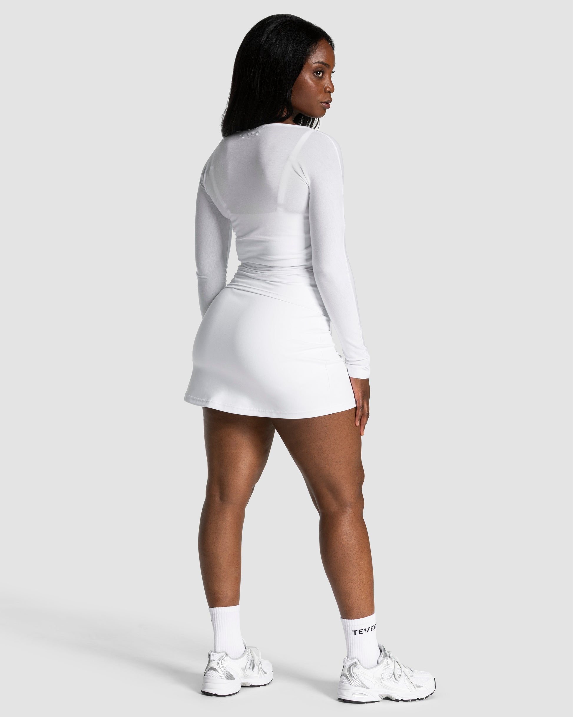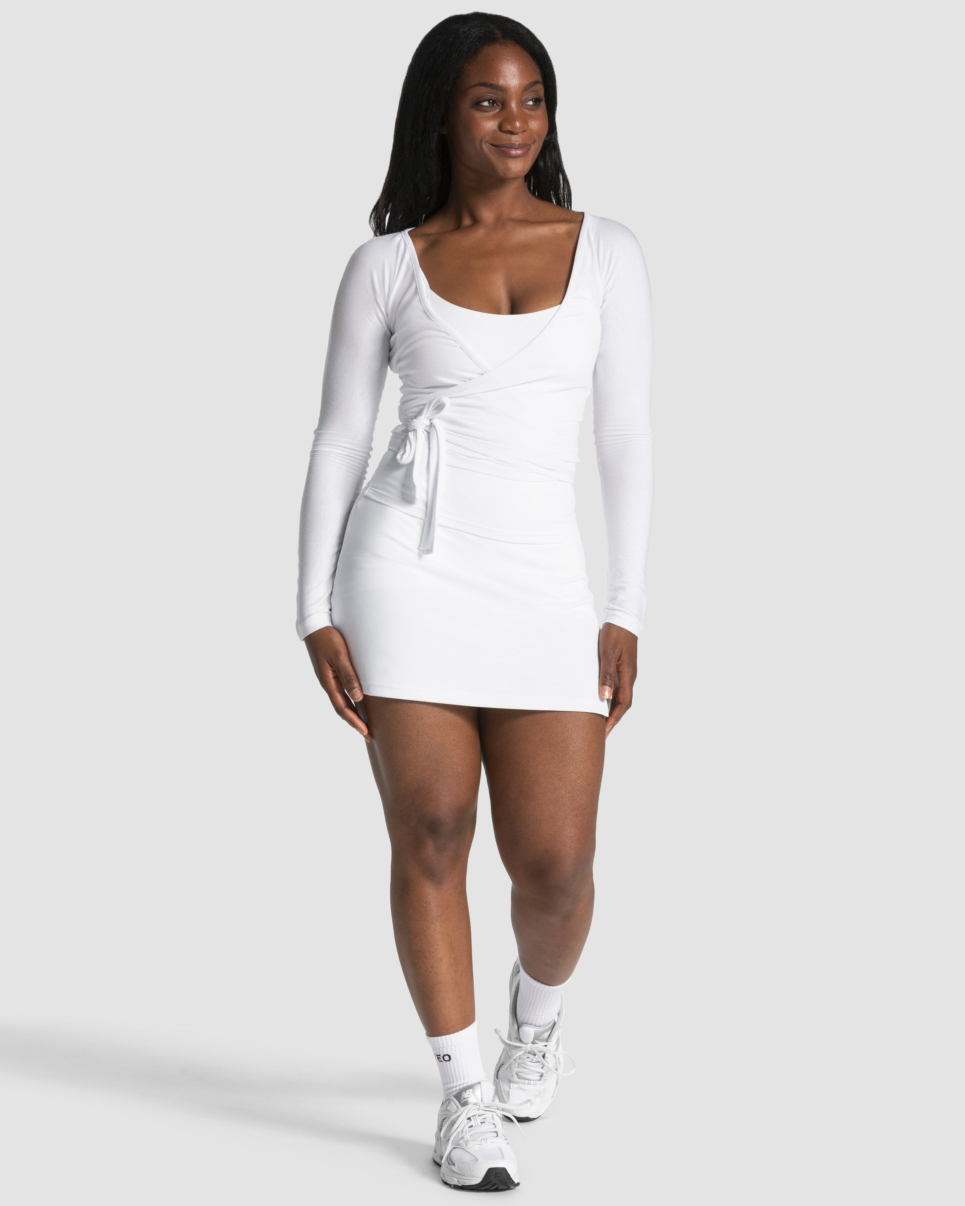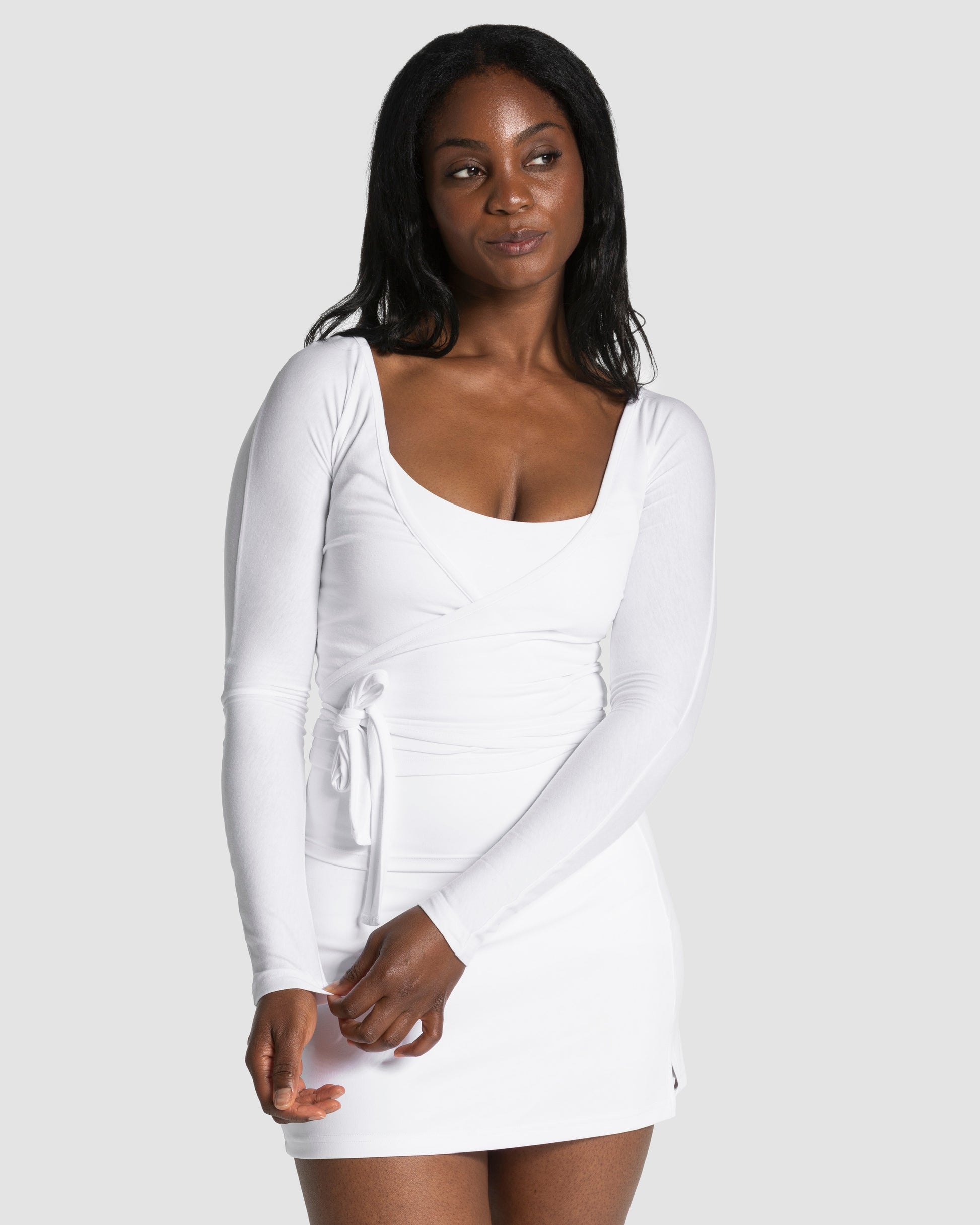 Du kannst das Mellow Wrapped Longsleeve optimal mit dem Mellow Cami Top und dem Mellow Skort kombinieren. Hier findest du nochmal alle Vorteile des Mellow Wrapped Longsleeves in Weiß: