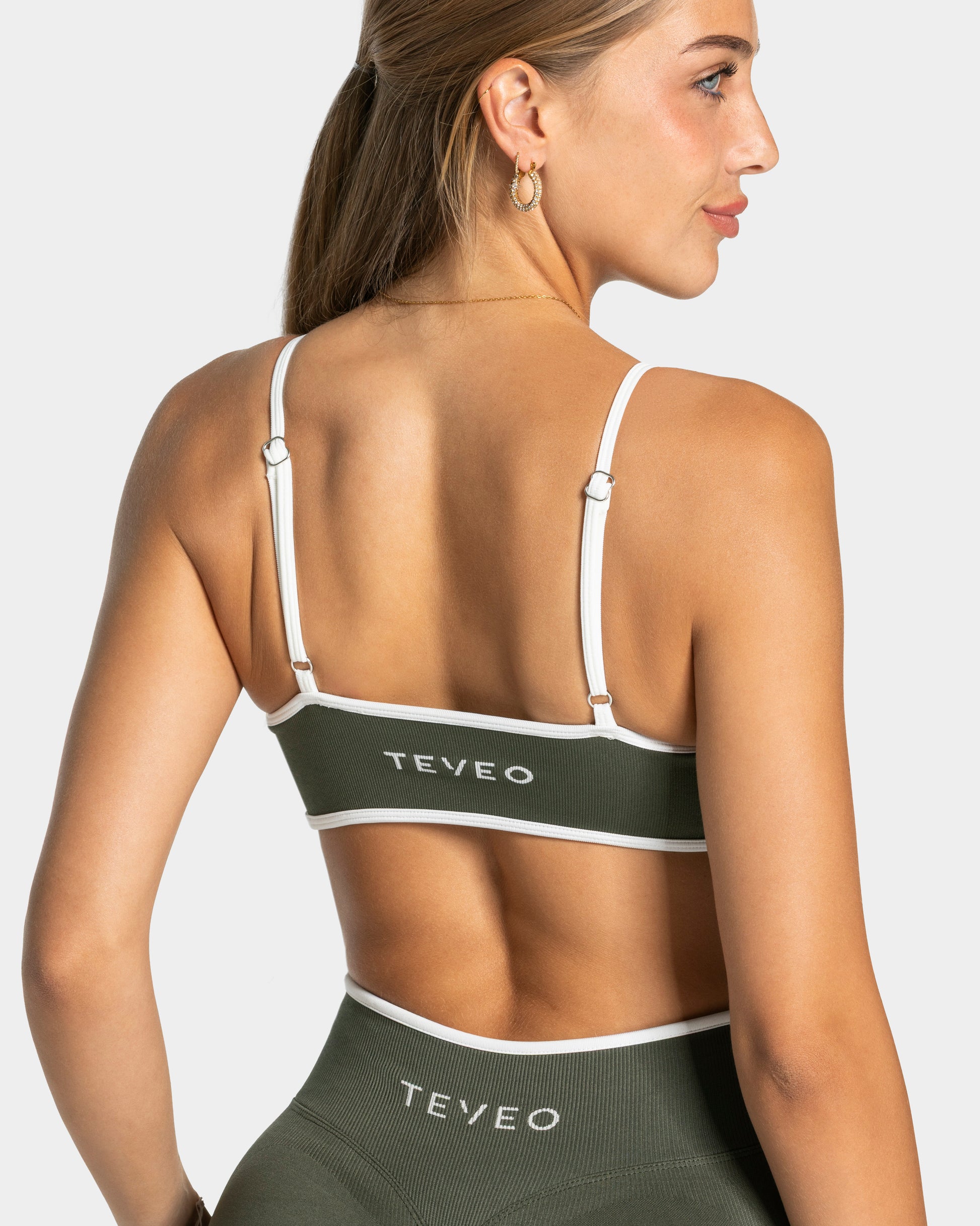 The Contrastline Sports Bra is available in several colours and pairs perfectly with the Contrastline Sculpt Scrunch Shorts or Leggings, as well as the Contrastline Joggers. Here’s a quick overview of all the benefits of the Contrastline Bra in: Khaki: