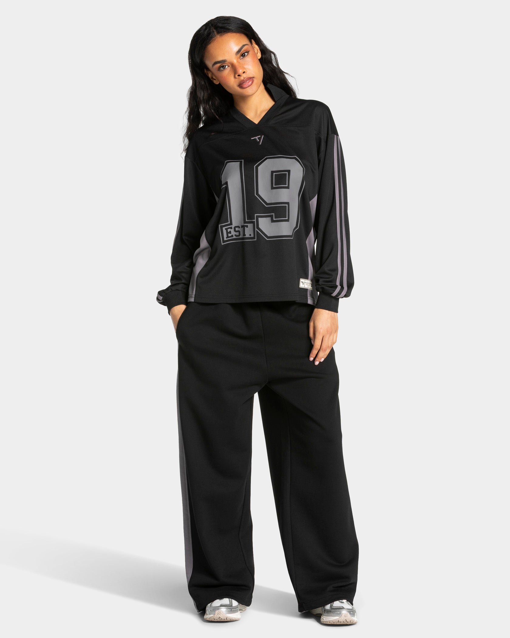 The Football Polo Longsleeve in black keeps you pitch-ready with its oversized fit and softly draping, subtly glossy mesh fabric. Contrast stripes on the sleeves and side panel inserts, paired with a polo collar and ribbed cuffs, nail that college-inspired look. A logo back print, logo patch, and contrast TV logo with ‘est. 2019’ underneath on the front add the finishing touches.