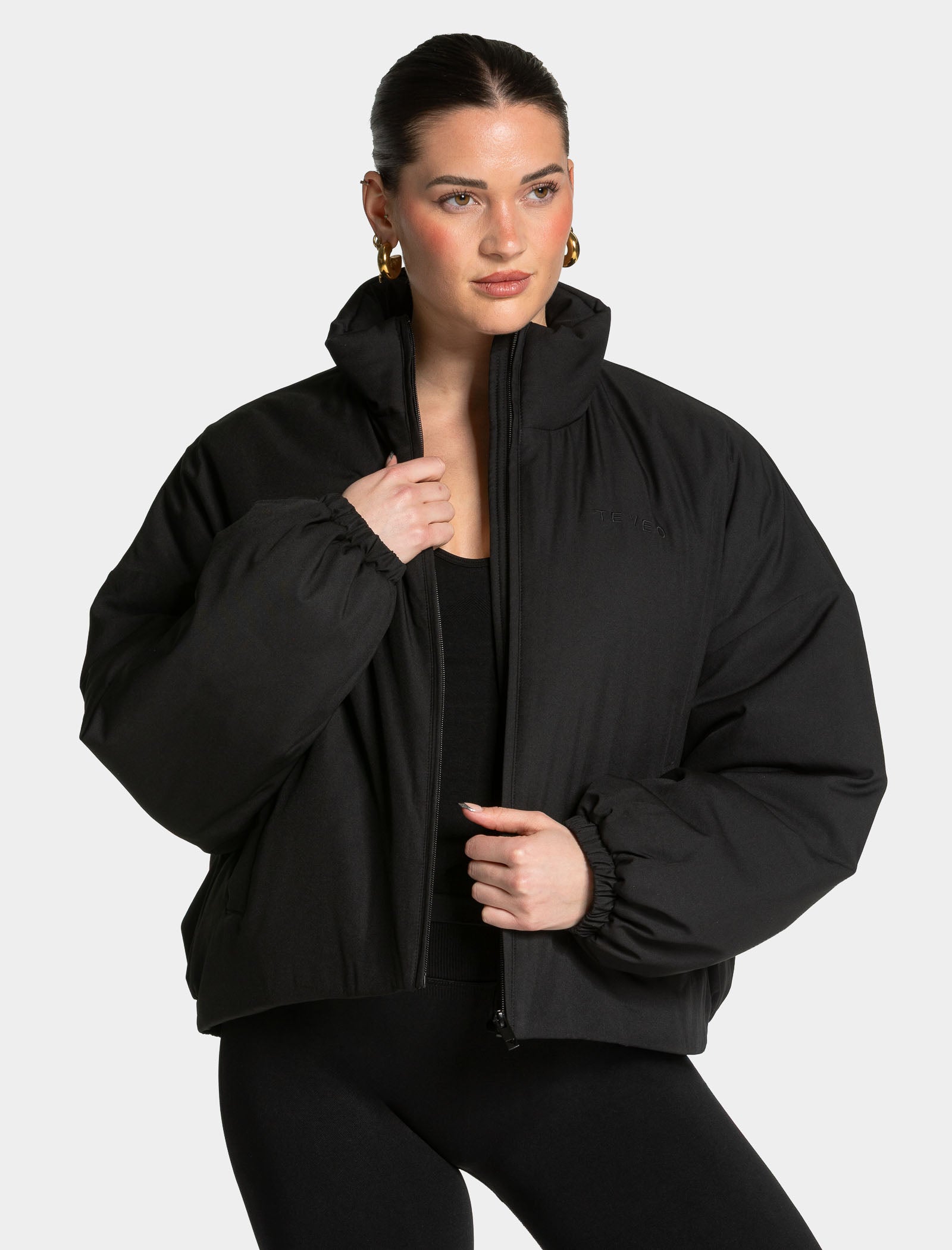 The Lift Bomber Jacket in black, with its cropped, oversized fit and dropped shoulders, creates a relaxed, sporty look and is perfect for mild days. The stand-up collar and adjustable elasticated hem offer added flexibility, while the side pockets with press studs keep your essentials safely tucked away. The design of the bomber jacket is finished off with the tonal embroidered TEVEO logo.
