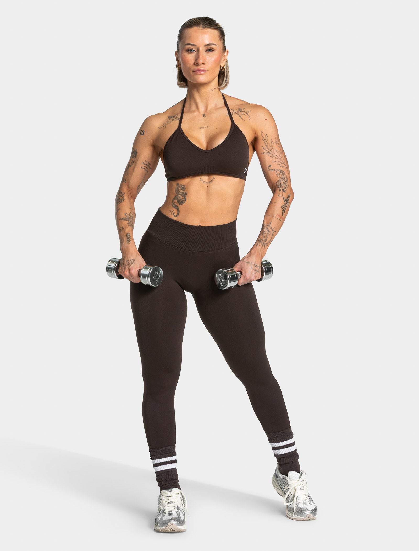 The Lift Bra in dark chocolate delivers powerful compression thanks to its piqué texture, giving you the support you need to move freely through any high-performance workout. The ribbed detailing under the bust and at the waist gives you the ultimate shaping effect. With its adjustable, detachable strap, the bra can also be worn as a halterneck or cross-back. The embroidered contrast TV logo completes the design.