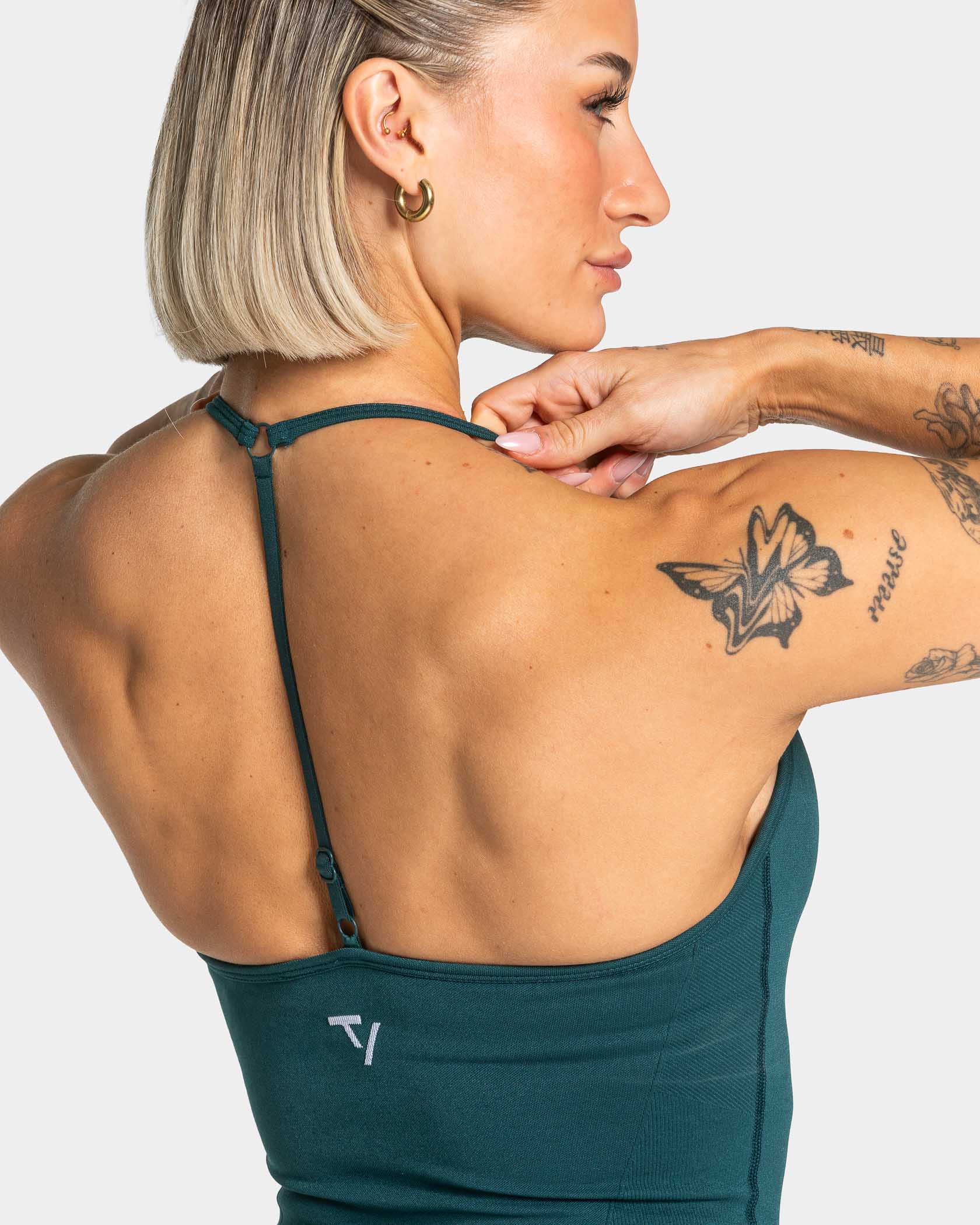 The Lift Cami Top in teal delivers powerful compression thanks to its piqué texture, giving you the support you need to move freely through any high-performance workout. In addition, the Cami Top offers a sculpting effect thanks to the ribbed detailing under the bust and at the waist. The integrated bra with removable pads and adjustable strap ensures maximum comfort. The design is finished with an embroidered contrasting TV logo.