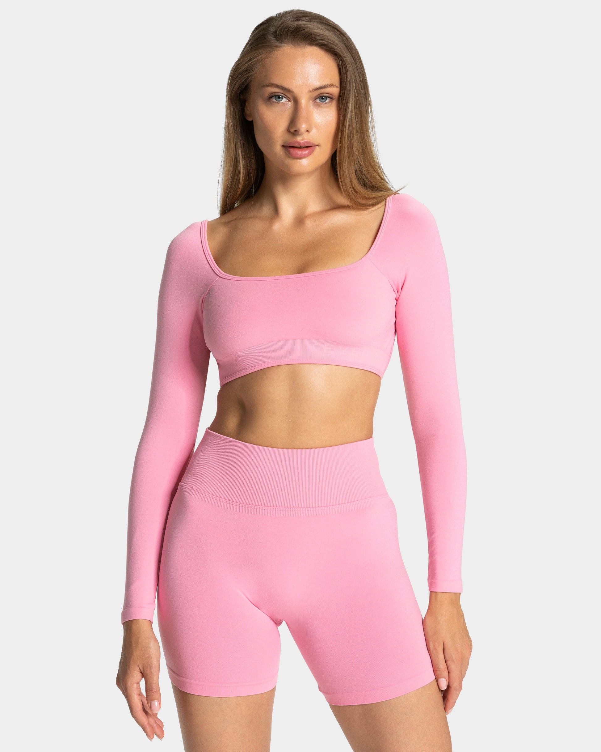 The Femme Backless Longsleeve in pink is cropped and features a simple design with a discreet TEVEO logo at the front. The back is beautifully accentuated by a plunging neckline with three subtle straps. The adjustable straps also allow it to be personalised.