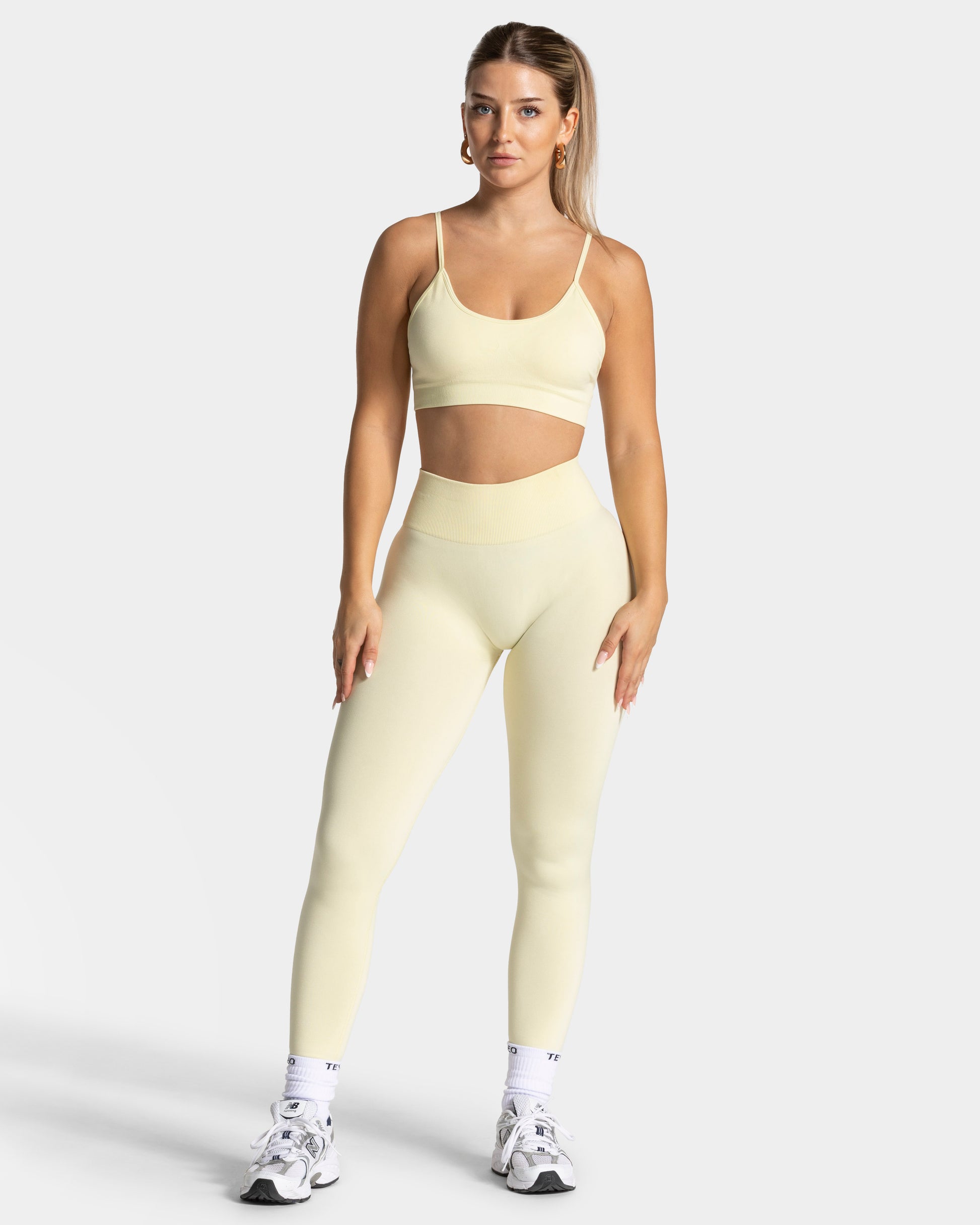 The Timeless Pro Bra is also available in other colours and pairs perfectly with our Timeless Pro Leggings and Shorts, as well as the Timeless Pro Covert Scrunch Leggings and Shorts. Here’s a quick overview of all the benefits of the Timeless Pro Bra in butter yellow: