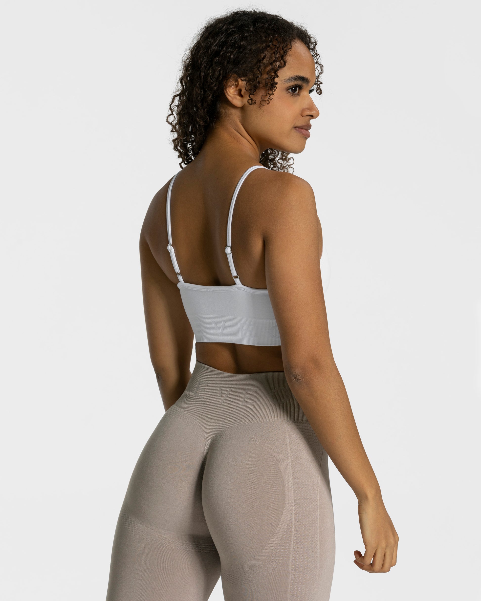 The Focus Bra in white with removable pads is the perfect partner to the Focus Leggings. The band provides excellent support. The Focus Bra in white highlights your cleavage with a V-neckline and front scrunch detail.