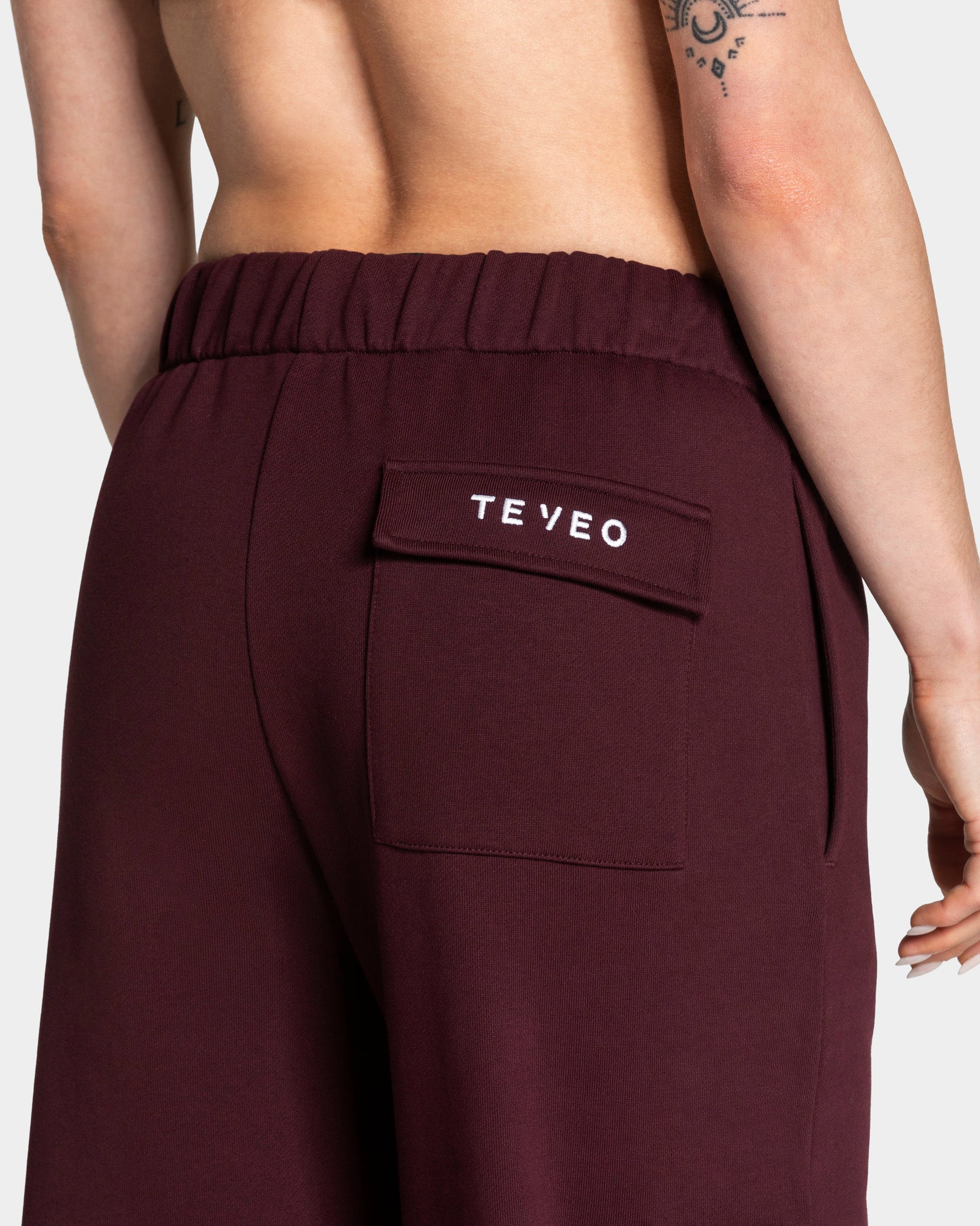 The Lift Wide Leg Cargo Joggers in merlot stand out with their side patch cargo pockets featuring Velcro fastenings, along with a patch pocket on the back. Both the fold-over waistband with drawstring and inner TEVEO logo tape, as well as the elasticated cuffs, offer flexible adjustment options. The design is finished with an embroidered contrasting TV logo and an embroidered TEVEO logo on the back pocket.