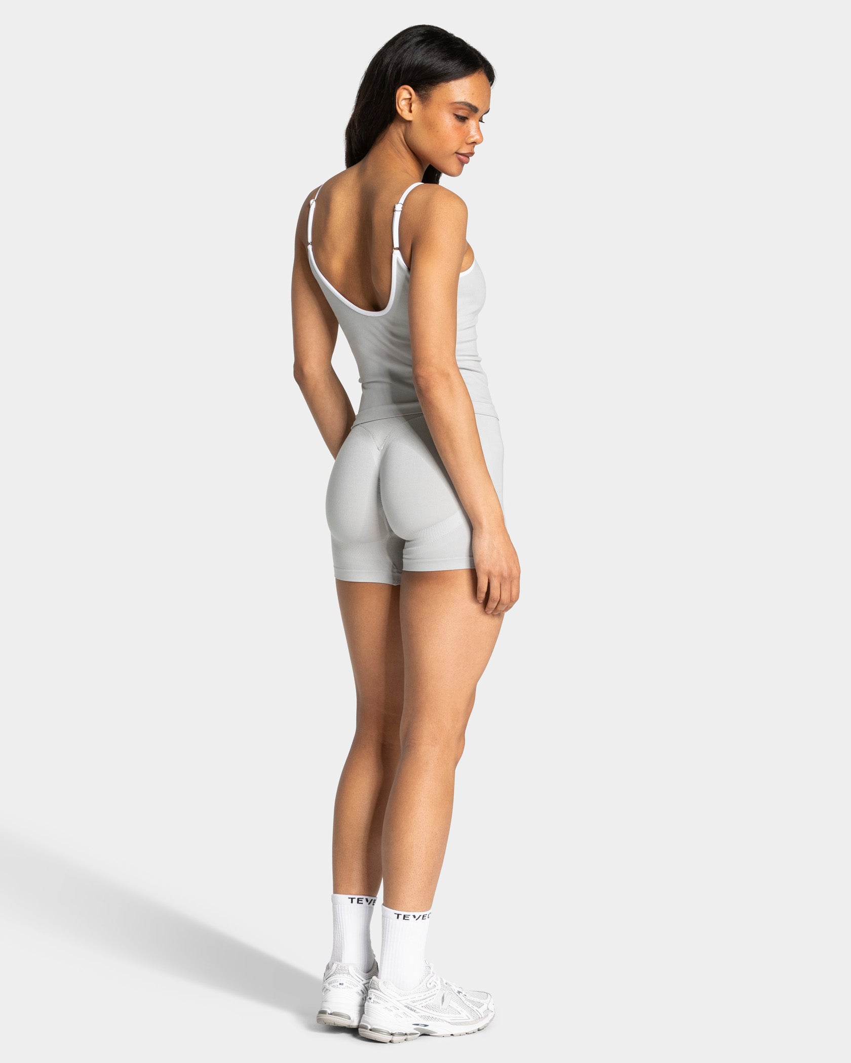 The Contrastline Sculpt Scrunch Shorts in moon enhance your bottom with their discreet, internally reinforced scrunch design. At the same time, the sculpting V-waistband and the push-bottom contour deliver the signature TEVEO push effect. The white contrast stitching on the shorts creates a sporty yet elegant look.