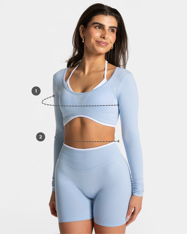 The Contrastline Long Sleeve is available in several colours and pairs perfectly with the Contrastline Sculpt Scrunch Shorts or Leggings, as well as the Contrastline Joggers – for a look that delivers on performance and style. Here’s a quick overview of all the benefits of the Contrastline Longsleeve in baby blue :