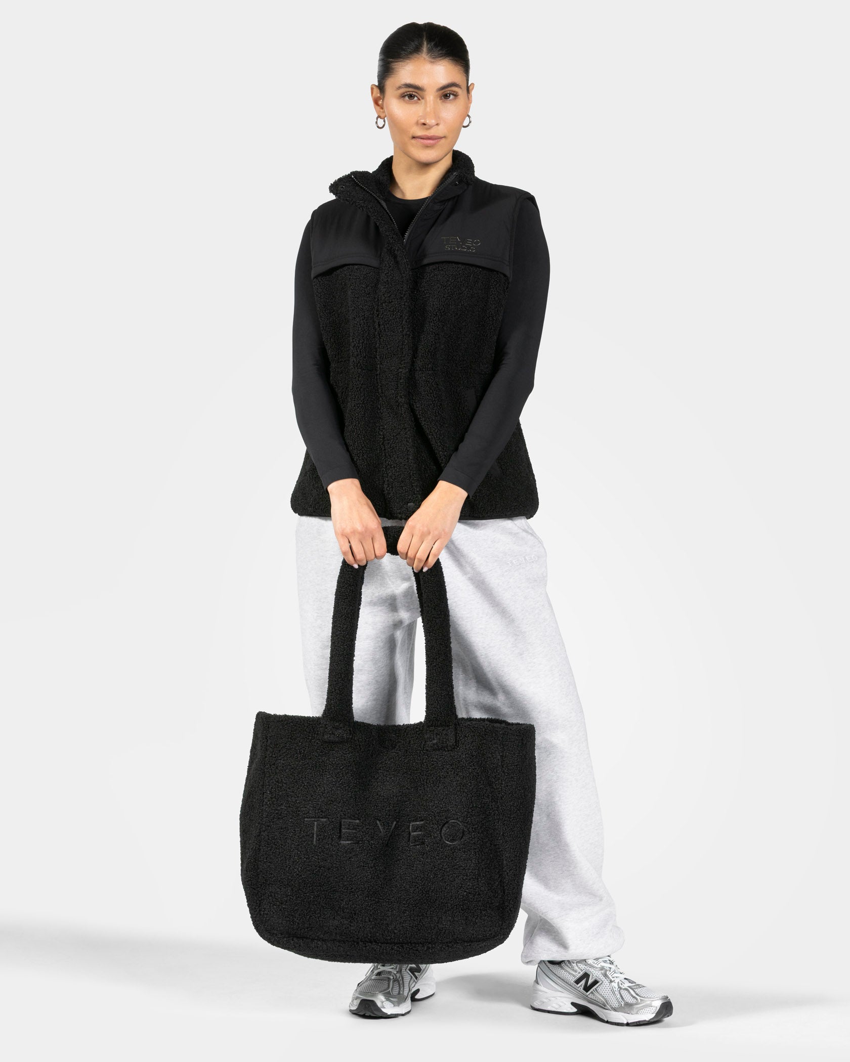 The Studio Teddy Bag in black blends ultra-soft teddy fabric with a clean design for a modern, elegant look. A magnetic fastening allows for easy opening and closing. Inside, the bag features a separate padded laptop compartment with a tab and Velcro fastening – ideal for keeping your essentials secure. An additional zipped inner pocket keeps smaller items like keys or your phone organised and within easy reach. Design details such as the rubber patch with TEVEO logo on the tab and the tonal embroidered TEVEO logo on the front add to its premium feel.