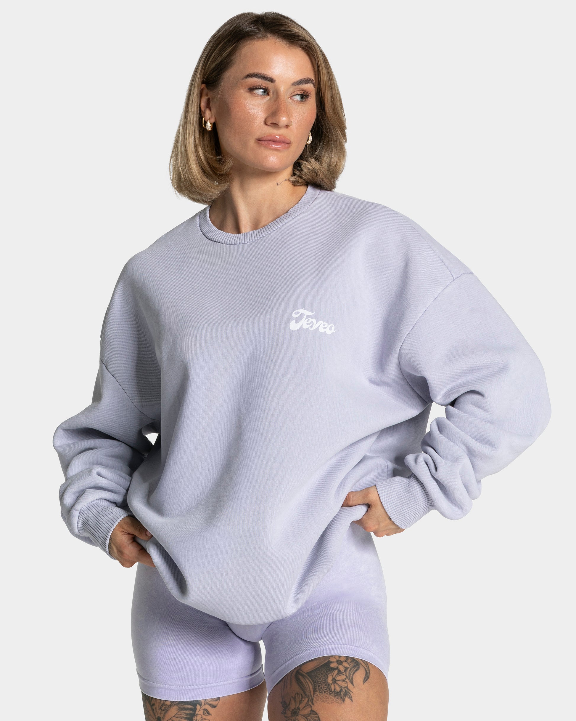 Our TEVEO Acid Oversized Sweater in lilac is perfect for cooler days, your warm-up or just for everyday wear. The large water-based print "Choose You" on the back is the real highlight of the sweater.