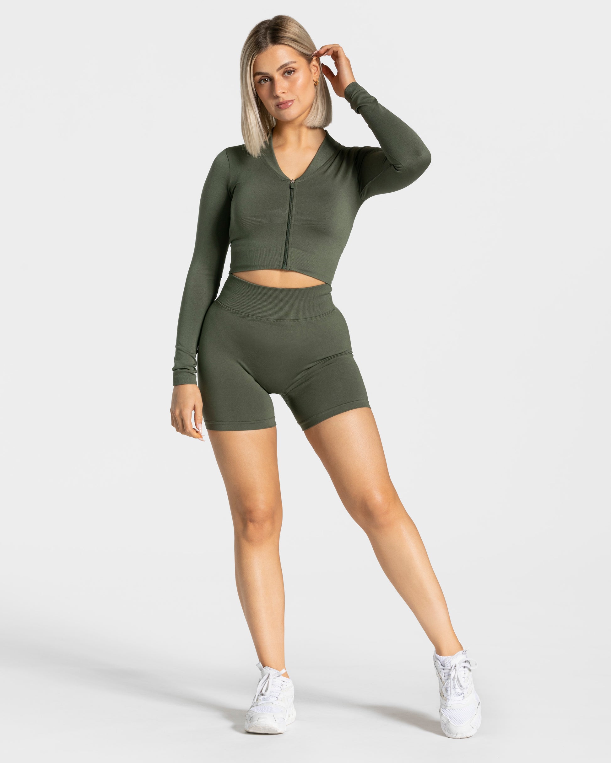 The Statement Scrunch Shorts in khaki combine the best features of the Timeless Scrunch and Sensation Leggings, perfectly showcasing your bottom. The scrunch at the back of the leggings and the high V-shaped waistband accentuate your curves, slimming your waist and tummy.