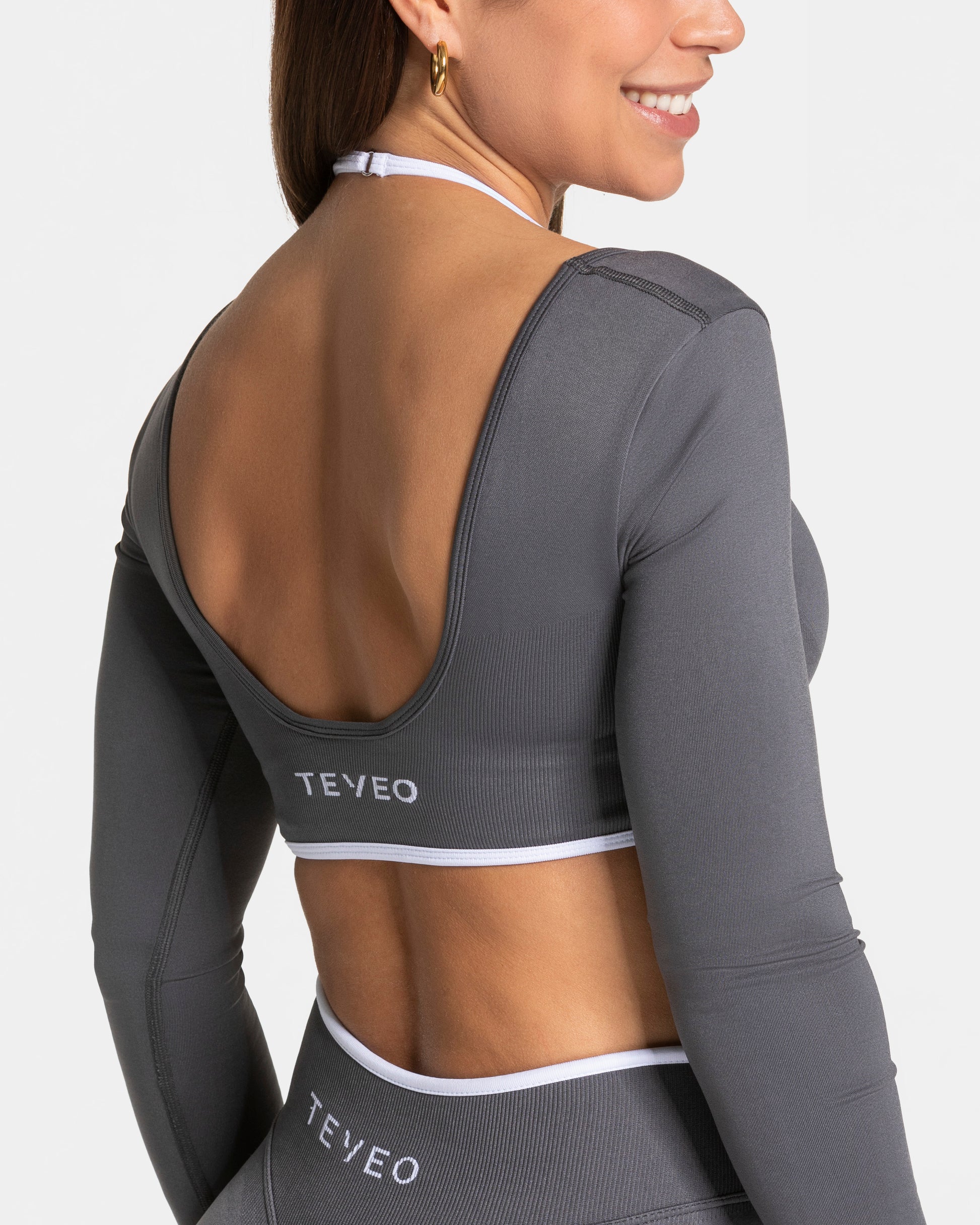 The Contrastline Longsleeve in graphite combines the features of a triangle bra and a long sleeve top, offering excellent support with its ribbed and piqué material on the chest and back. The white contrast stitching adds accents that perfectly match the colour of the integrated bra.