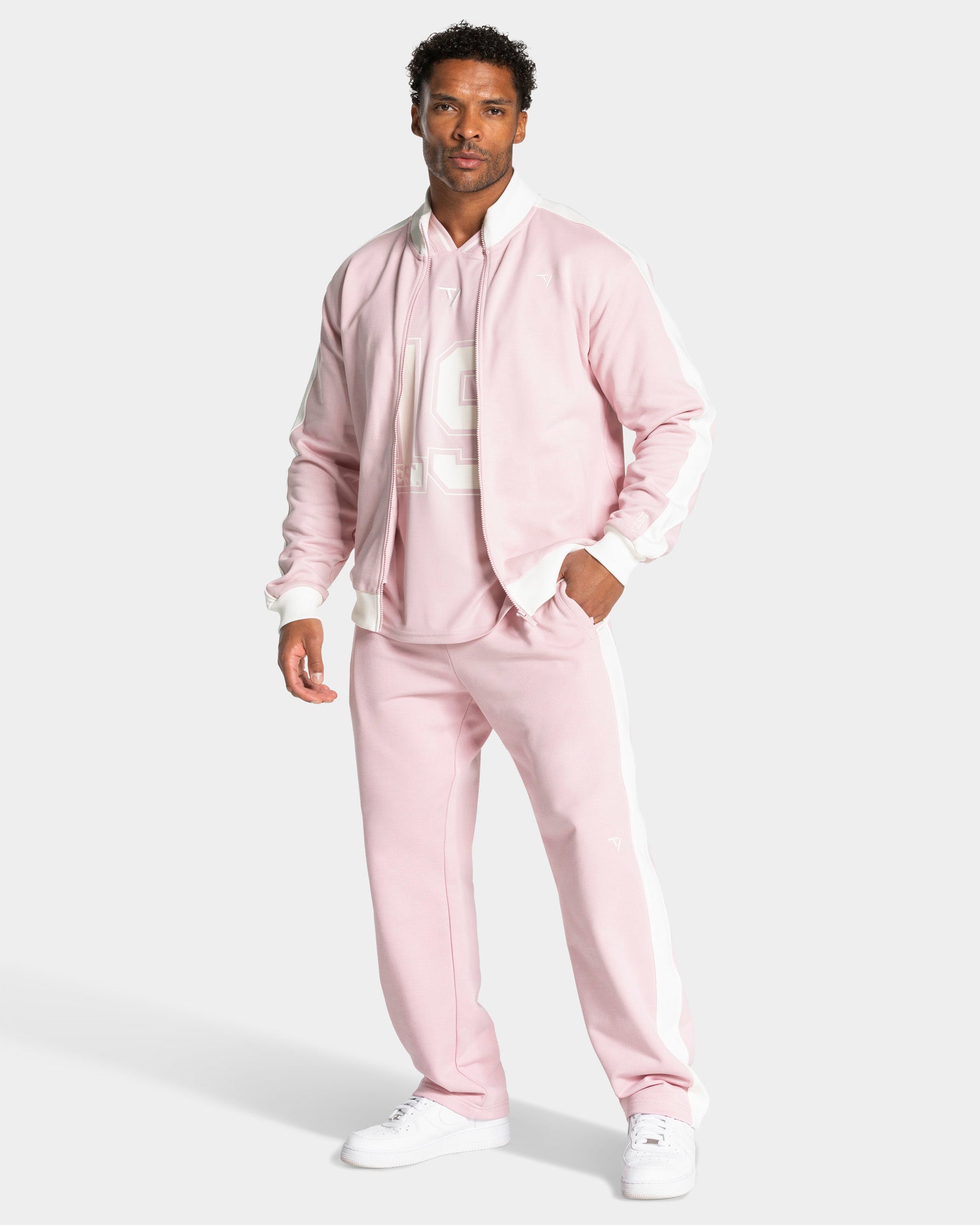 The Football Zip Jacket in light pink pairs perfectly with the rest of the Football Collection.