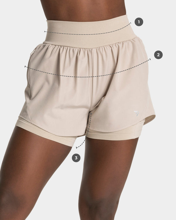 Le short Endorphin 2-en-1 est parfait avec n'importe quel haut de la collection Endorphin. Voici un aperçu de tous les avantages du short 2-in-1 Endorphin Latte :