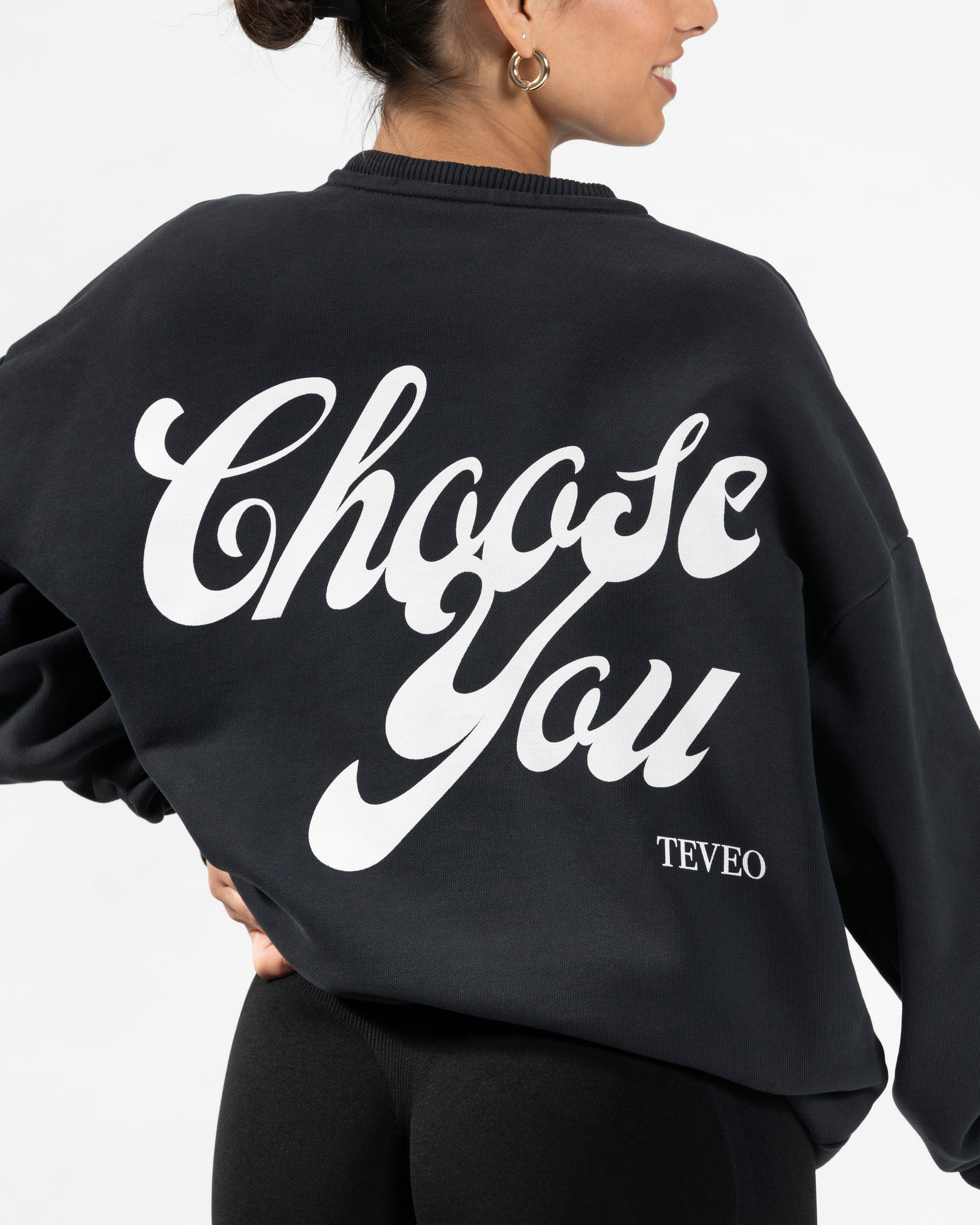 La nostra felpa TEVEO Pure Oversized nel colore nero è perfetta per le giornate più fresche, per il tuo riscaldamento e anche per tutti i giorni. La grande stampa a base acqua "Choose You" sul retro è l’elemento di richiamo assoluto della felpa.