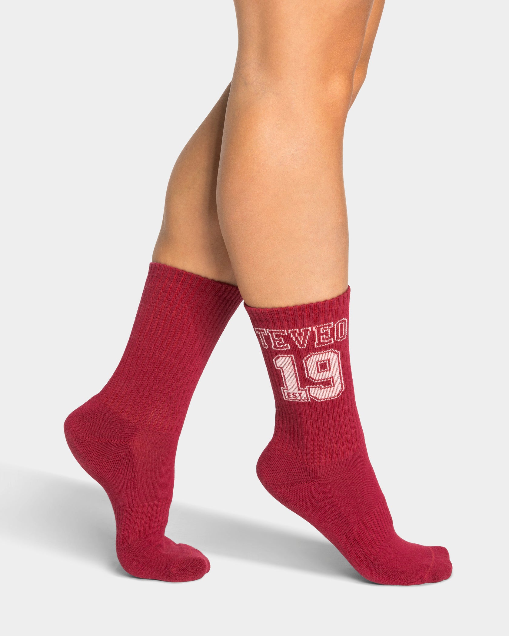 Con i loro dettagli e l’elevata vestibilità, le calze Football nel colore Cranberry e Off-White completano alla perfezione il tuo outfit Football. Grazie alla struttura a coste, il supporto sul collo del piede viene ottimizzato, mentre il rinforzo sulle dita e sul tallone aumenta il comfort. Il look è ulteriormente arricchito dal logo TEVEO a contrasto e dalla scritta “est. 2019”.