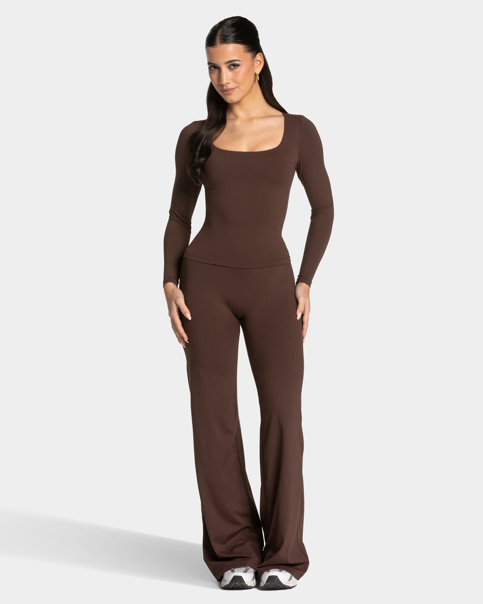 Wybierz dla siebie na trening i na co dzień. Koszulka z długim rękawem Allrounder w kolorze espresso to nowy, niezbędny element Twojej garderoby. Twoja nowa podstawa stylizacji zachwyca minimalistycznym fasonem z dużym okrągłym dekoltem oraz zintegrowanym biustonoszem z wyjmowanymi wkładkami i elastycznym pasem pod biustem, zapewniającym niezawodne trzymanie. Ultramiękki i oddychający materiał doskonale dopasowuje się do ciała i zapewnia chwile dobrego samopoczucia, a błyszczące logo TEVEO z tyłu dopełnia całości.
