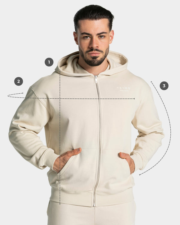 Der Lifting Club Zip Hoodie in Cream im leichten Oversized Look liefert, was du brauchst: Power, Funktionalität und einen Statement-Look. Der durchgehende Metallreißverschluss mit TV Puller, Rippabschlüsse an Saum und Ärmeln sowie zwei Taschen bieten dir nicht nur Funktionalität, sondern auch Flexibilität. Das Design spricht die Sprache echter Dedication: Auf der Vorderseite überzeugt das TEVEO Lifting Journey Logo als klares Statement. Der Backprint setzt mit dem großflächigen Artwork ein kraftvolles Zeichen und wird durch drei charakteristische Prints am Saum abgerundet: TV Journey, TEVEO Lifting Essentials und "One Day or Day One – You Decide" – ein Mindset, das die gesamte Kollektion prägt.